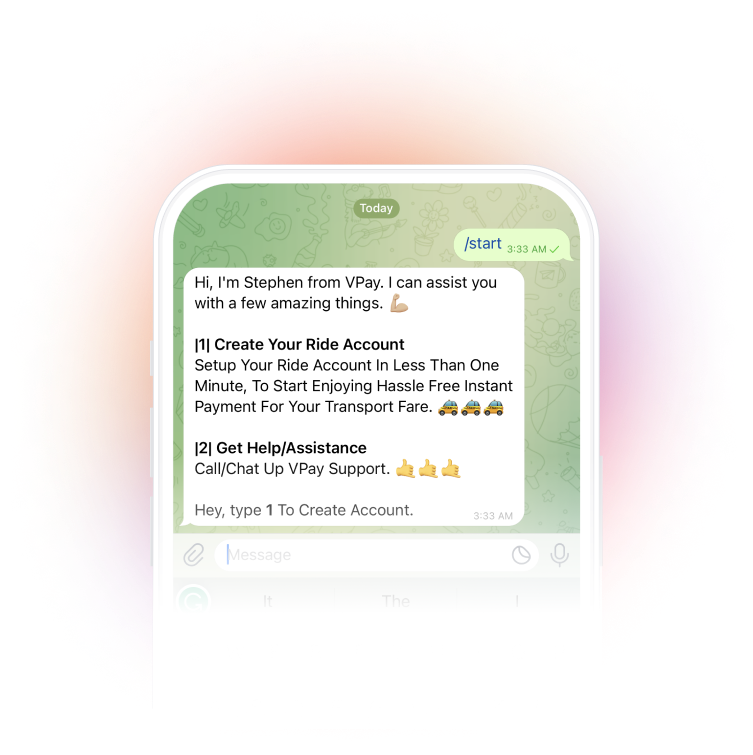 Press 1 to create your VPay Ride account. Follow the prompts on the Telegram page to provide your name and phone number.